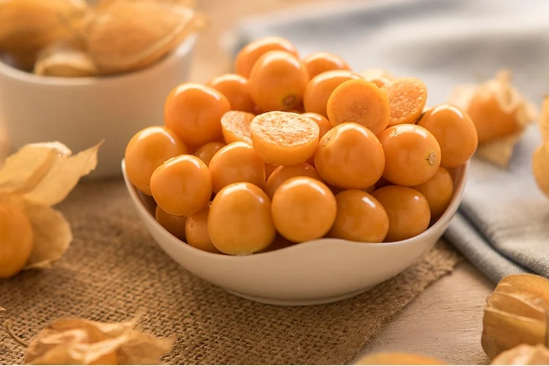 El aguaymanto es una fruta pequeña y dorada cubierta por una hoja seca natural que la protege. Tiene un sabor dulce con un toque ácido equilibrado.