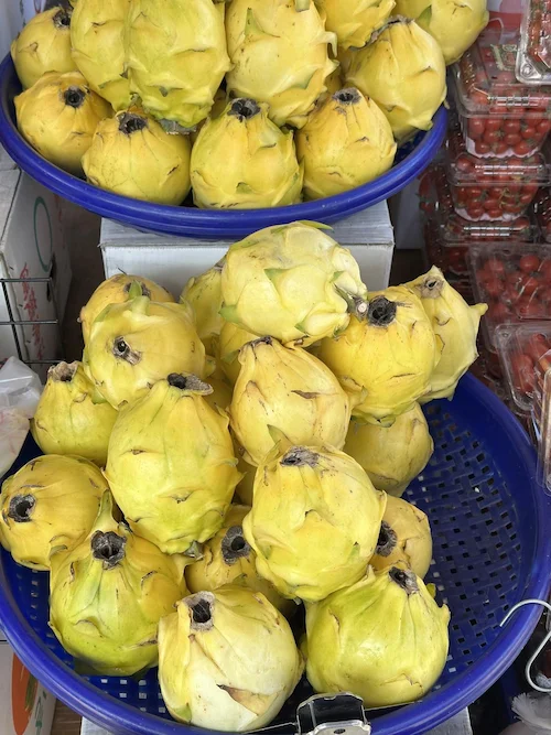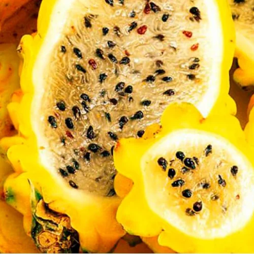 La pitahaya amarilla, conocida como fruta del dragón, tiene una cáscara brillante y pulpa blanca con pequeñas semillas negras. Su sabor es dulce y suave.